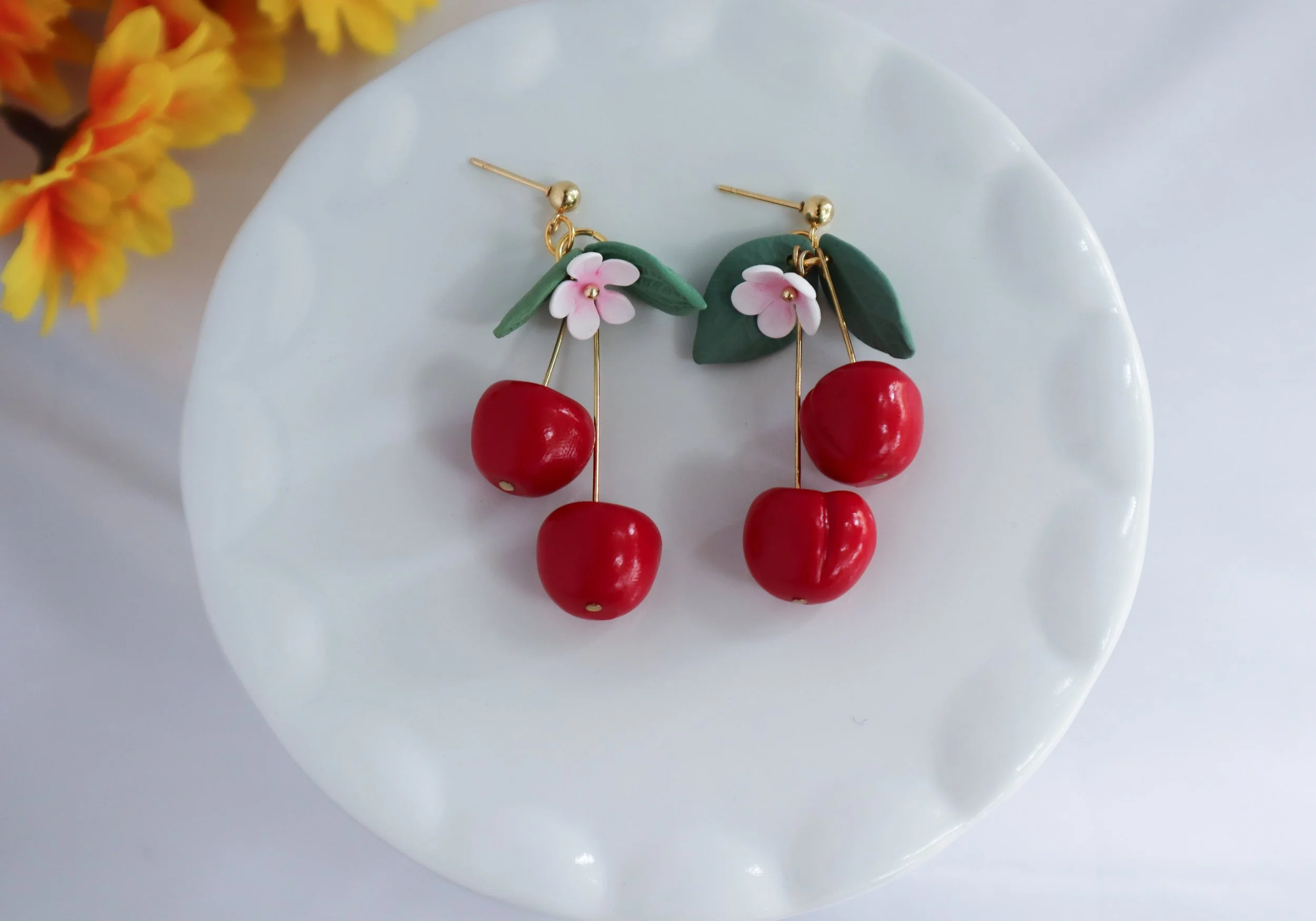 Add a pop of playful charm to any outfit with our signature Cherry Earrings. Handcrafted from lightweight polymer clay, these earrings feature vibrant red cherries with lush green leaves, offering a fresh, fruity vibe. Perfect for casual days or adding a whimsical touch to your look, they're comfortable to wear and built to last. Elevate your accessory game with these unique, trendy earrings—an irresistible must-have in your collection. Fast shipping and a delightful unboxing experience guaranteed.